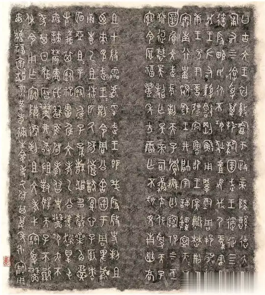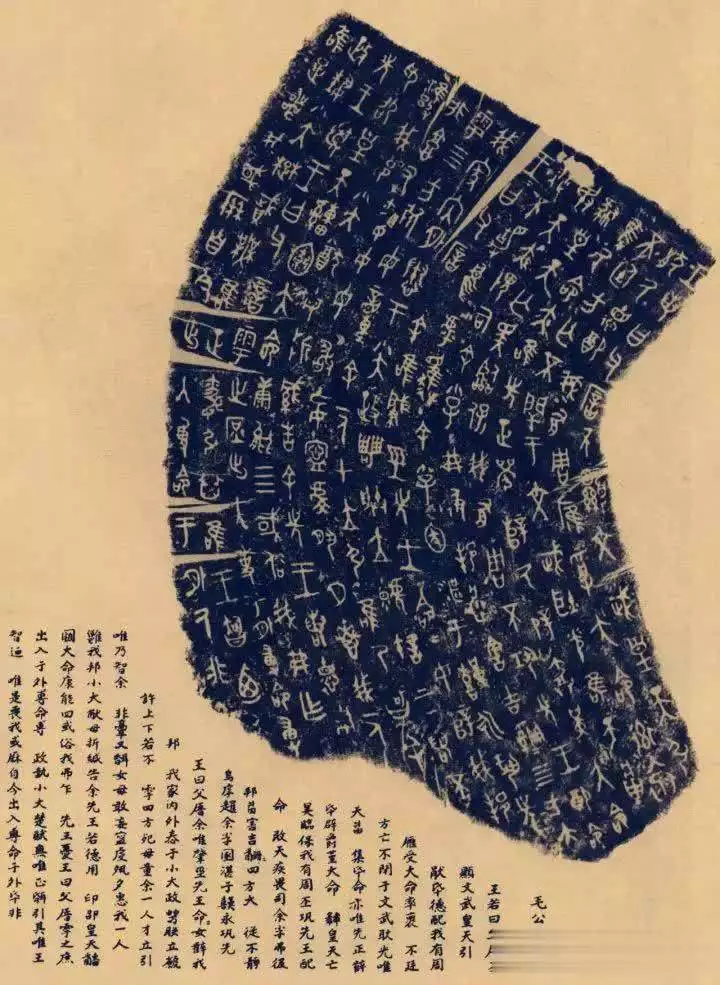 3、“成熟阶段”:西周昭王——夷王时期,主要特点是平稳整齐,笔画平直,笔锋收敛,雄浑流畅。 这个阶段(昭王、穆王、恭王、懿王、孝王、夷王之世),西周社会进入繁荣和稳定阶段,周人为巩固统治地位,礼乐制度进一步规范和普遍实行,金文也随之进入成熟期,用笔的起止处已明显比前期收敛,线条的粗细比较一致,章法布局日趋整齐,各种铭文之间面貌趋向一致,差别不大,甚至雷同。如《墙盘铭》(恭王时)、曶鼎铭(懿王时)、《大克鼎铭》(孝王时)等。需要说明的是,这一段之前,自商盘庚殷墟开始,青铜器制造已处于鼎盛时期,为何金文书法到周昭王才步入成熟期?我认为金文书法作为一种文化现象应该是稍微后于制造业发展阶段的。