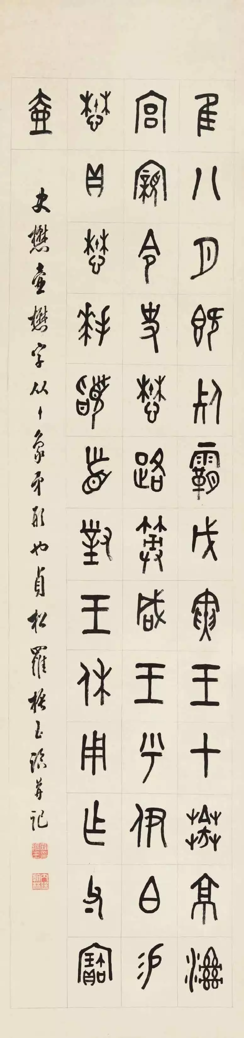 4、“繁荣阶段”:西周厉王时期——西周幽王时期,主要特点是线条匀称,结体流畅,章法有序,工整典雅。 这个时期(厉王、共和行政、宣王、幽王)大约有一百年时间,是西周金文书法繁荣阶段。一是铭文数量多、篇幅长。如:《散氏盘铭》(约厉王时)、《史颂簋铭》、《颂簋铭》、《虢季子白盘铭》(宣王时)、《毛公鼎铭》(宣王时,497字,最长,现存台北)、《叔专父盨丁器铭》。二是在主流风格上,前期那种随意和自由的面貌消失,笔法规范,工整秀丽,整齐端庄,不同铭文的风格大同小异。值得注意的是这一阶段,也出现了一些与主流风格不同的铭文,如:《散氏盘铭》、《圅皇父簋铭》、《楚公钟铭》等。