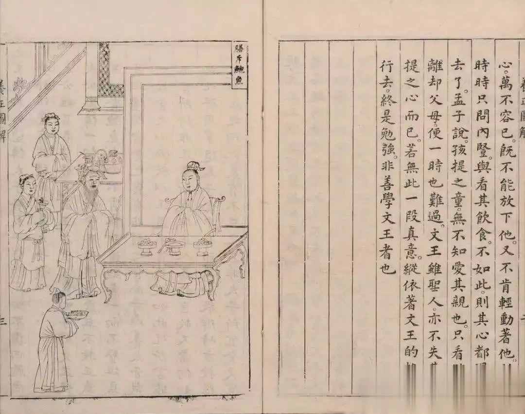 《养正图解》,是明万历中曾经担任过皇太子讲官的焦竑编著的。经理镌刻的是“南京吏科给事中”祝世禄。于万历中刻于金陵。全书凡六十图,每图后有故事说明,大抵从古书中节取。接下去是焦竑的讲解,间用口语,并有所发挥。祝序中首先提到“高皇帝尝命诸臣绘农业艰难图、古孝行图进太子诸王”,可见朱元璋是注意用形象教材对皇位接班人进行教育较早的一位皇帝。接受了朱元璋的意旨并进一步发展为大型图说的则是焦竑。他认为,“盖讲读止于析理,图说兼以征事。理之用虚,虚故隐约言之而不必有所指;事之指实,实故览之者易竟,而愈以明理之用。”(祝序)这大约可以算做古来一切看图识字类读物的理论说明。焦竑“仰遵祖训,采古言行可资劝戒者,著为图说”。他宣传的当然是封建道德规范与家法、教条。这书不同于一般民间通俗读物,是为皇太子准备的教材,所以刻版十分讲究,祝世禄在序中特别指出了“绘图为丁云鹏,书解为吴继序,捐赀镌之为吴怀让,而镌手为黄奇。”在序文中郑重介绍画家、书手、刻工,这办法就不多见。金陵是明代的留都,也是出版中心之一。丁云鹏是安徽人,黄奇是新安诸黄的先辈,这许多,就都使《养正图解》在版画书中占有重要的地位。